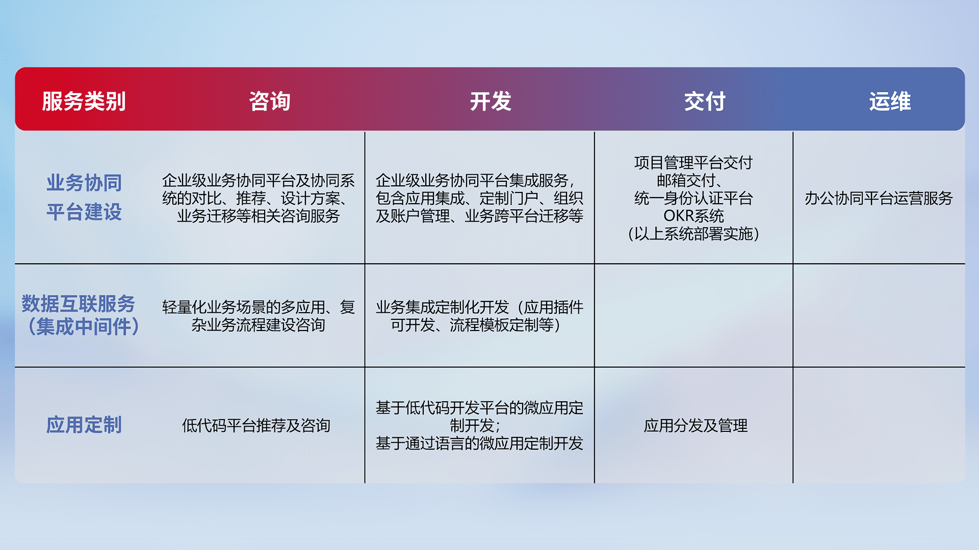 针对钉钉、、企微、、、、IDaas等平台级产品提供产品的规划、、方案、、、交付、、、定制化开发等服务,,,实现如统一协同办公、、智能客户服务、、混合会议管理、、智能数据查询、、、等业务场景,,实现数字化转型。。。